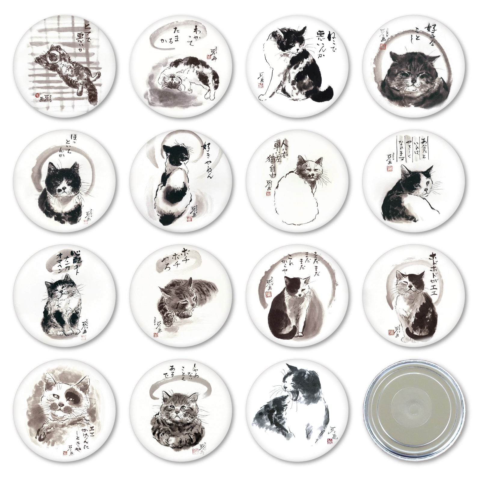 This circular magnet features a cat drawn by sumi-e artist Minoru Nakahama and a humorous message.