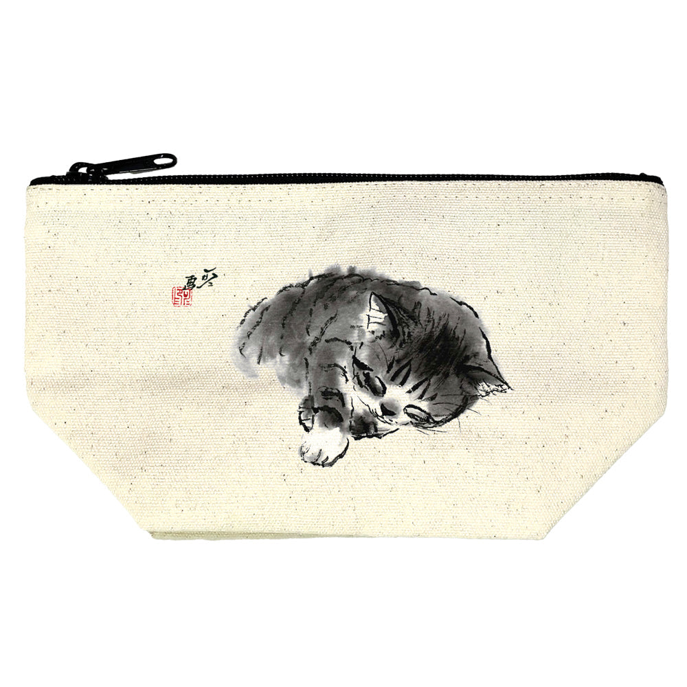 Gusseted pouch by Minoru Nakahama, "Sleeping, Right Hand" Canvas cosmetic case, accessory case, cat ink painting artist