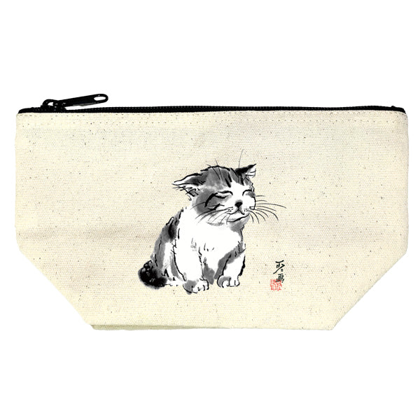 Gusseted pouch by Minoru Nakahama "Waking up" Canvas cosmetic case, accessory case, cat ink painting artist