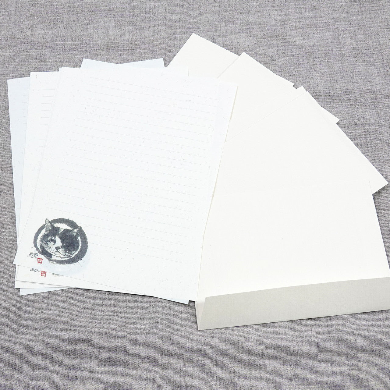 和紙のような繊維が入った便箋に中浜稔さんの墨絵の猫がプリントされた和風テイストのレターセットです。
