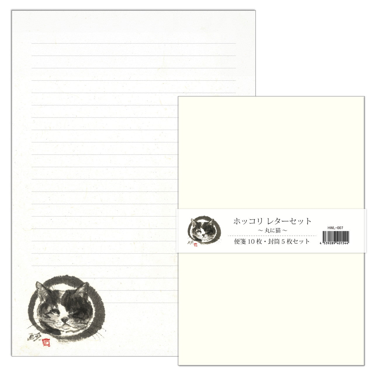 A5レターセット 中浜稔「丸に猫」猫墨絵作家 アイボリー 手紙 便箋 封筒 和風