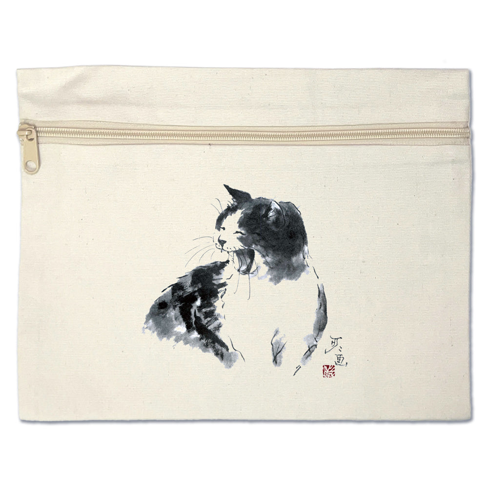 フラットポーチ大 中浜稔「笑い」コットン コスメケース 小物入れ 猫墨絵作家