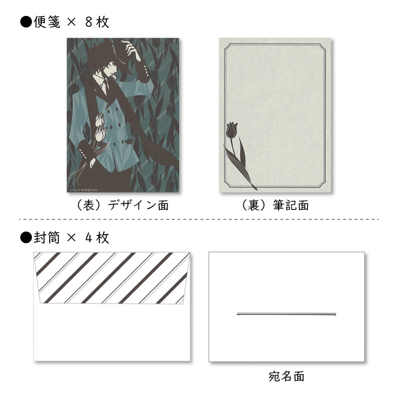 ミニレターセット ワカマツカオリ「男性とチューリップ ブラック」作家 手紙 便箋 封筒 男の子 ボーイ スーツ 花 植物